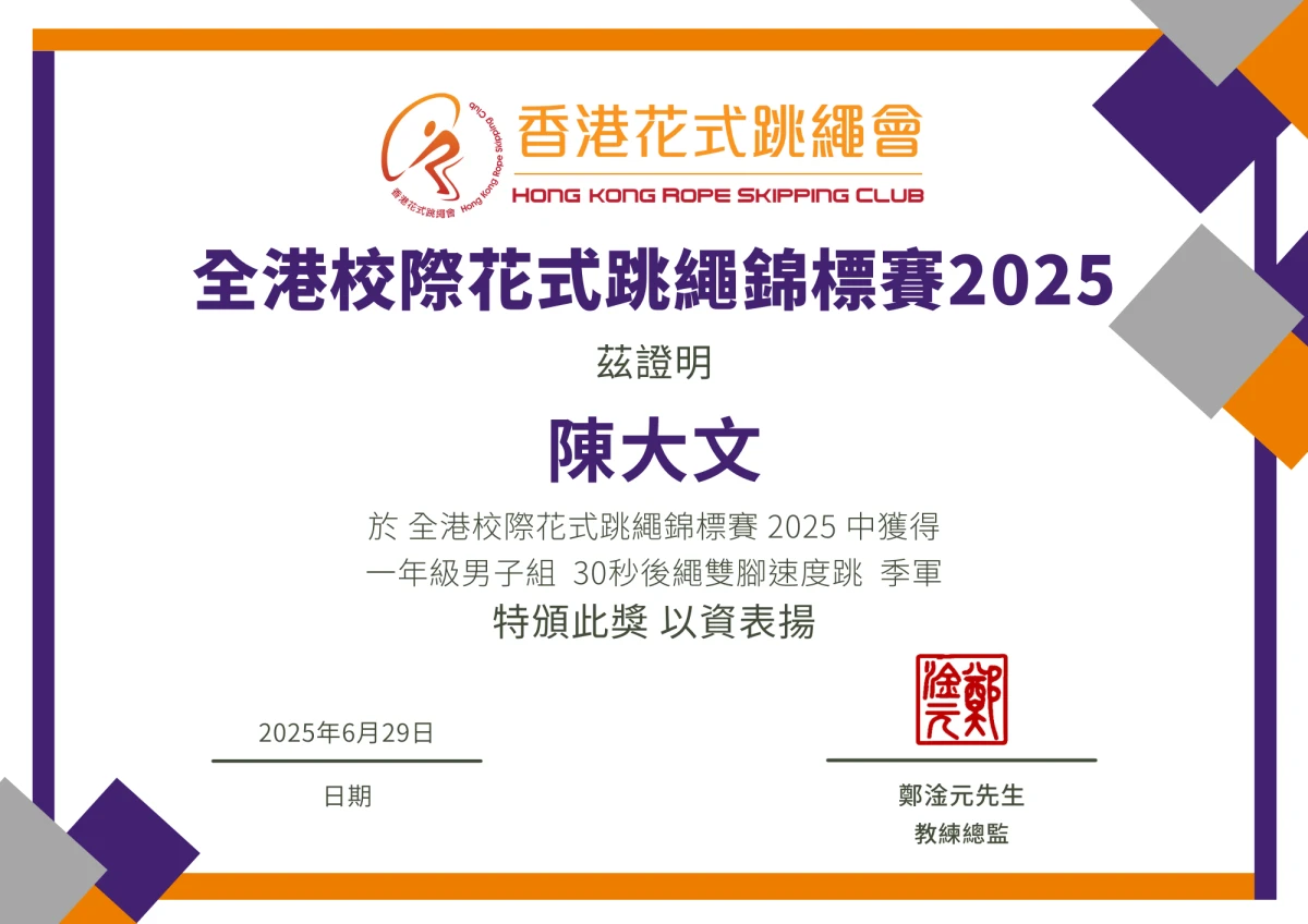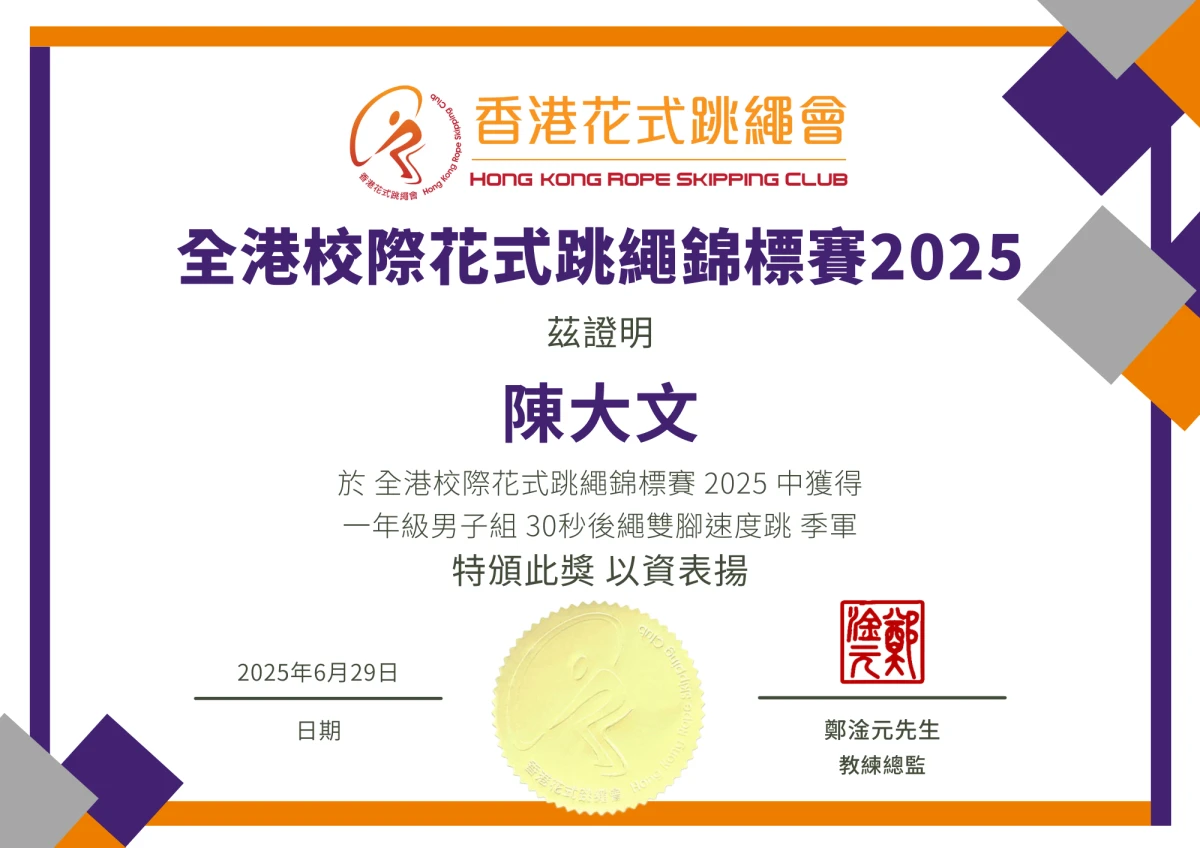 • 校際總成績頭四名隊伍的運動員可申請得獎證書(冠軍、亞軍、季軍、殿軍)
